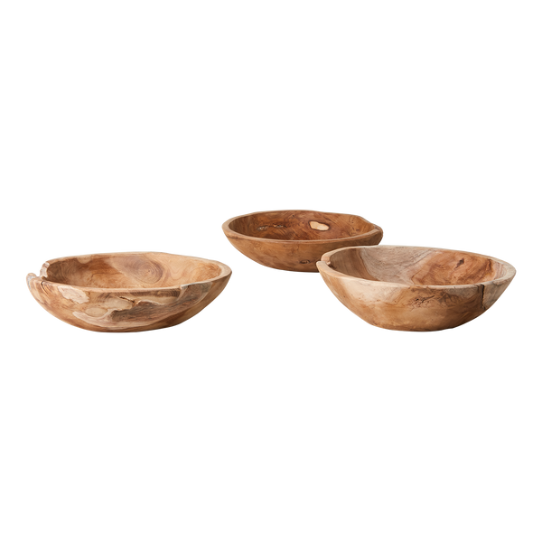 En unik skål laget av teakrøtter, med vakre naturlige fargetoner og organiske former. Hver skål er håndlaget og helt unik – ingen er like. De naturlige sprekkene og årringene forteller sin egen historie og gir et rustikt, levende uttrykk.