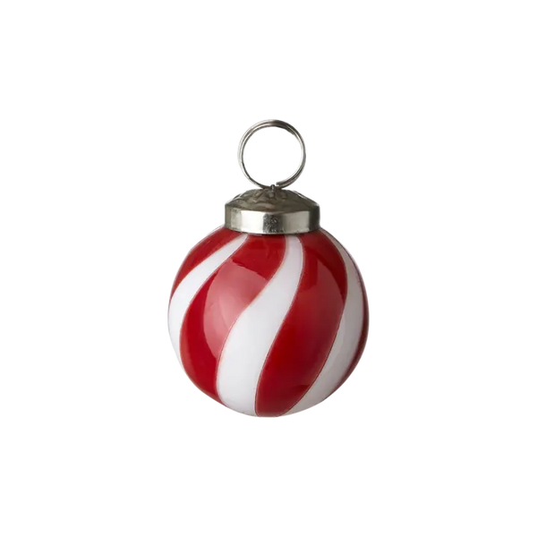 Klassisk og nostalgisk julekule i glass med hvite og røde striper. Den blanke overflaten og tidløse fargekombinasjonen gir et elegant uttrykk på juletreet – perfekt for deg som elsker den tradisjonelle julefølelsen.