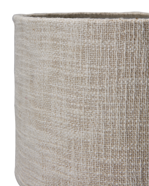 En unik bordlampe i naturmaterialer som kombinerer moderne design med organisk tekstur. Den håndlagde foten i papirmasjé og jern gir lampen et kunstnerisk uttrykk, mens den vevde bomullsskjermen sprer et mykt og behagelig lys.