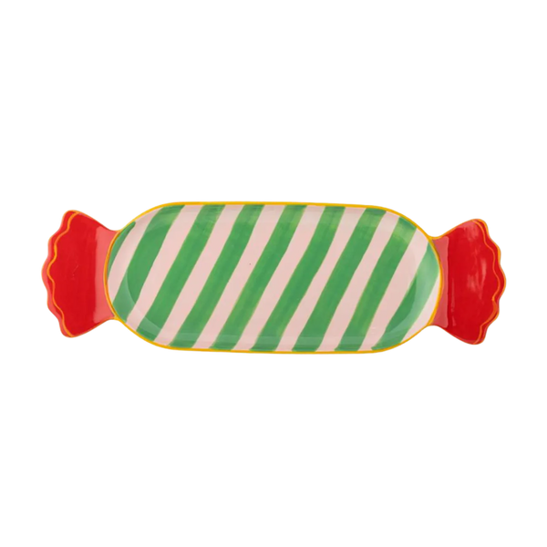Caramella serveringsfat fra Bloomingville er et blikkfang på bordet – formet som et godteristykke og dekorert med håndmalte detaljer. Hvert fat har sitt eget uttrykk, noe som gjør det til en personlig og sjarmerende del av serviset.