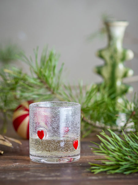 "Debra" drikkeglass fra Bloomingville er et rustikt munnblåst glass, med en vakker bobleeffekt. Glasset er dekorert med små, håndlagde hjerter som gir et lekent og koselig uttrykk. De håndlagde detaljene gjør hvert glass unikt og tilfører et sjarmerende preg til borddekkingen.
