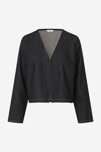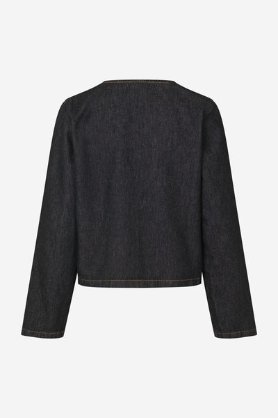 Langermet topp i bomullsdenim med sort rinse-vask og kontrastsømmer. Modellen har V-utringning og skjult hektelukking foran. Rett, boksy passform gir et moderne og avslappet uttrykk – perfekt til både jeans og skjørt.