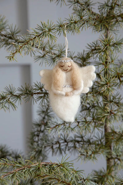 En vakker engel fra Gry & Sif – håndlaget i tovet ull med en mykt skinnende sølvglorie. Den milde og fredfulle utstrålingen gjør henne til en nydelig detalj i julepynten, enten hun henges på grener, gaver, knagger eller i en julekalender.