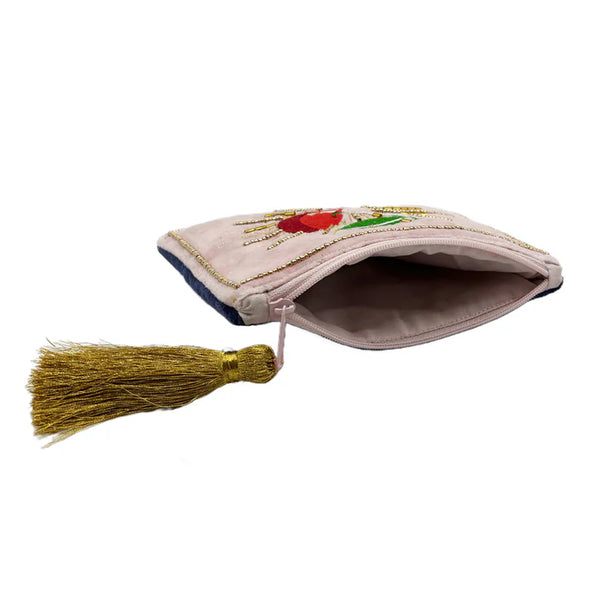En luksuriøs liten pung i rosa fløyel, dekorert med vakre broderte kirsebær, gullfargede perler og glitrende detaljer. Motivene fremheves av en gullbrodert solstråle og rammes inn av en elegant perlekant.