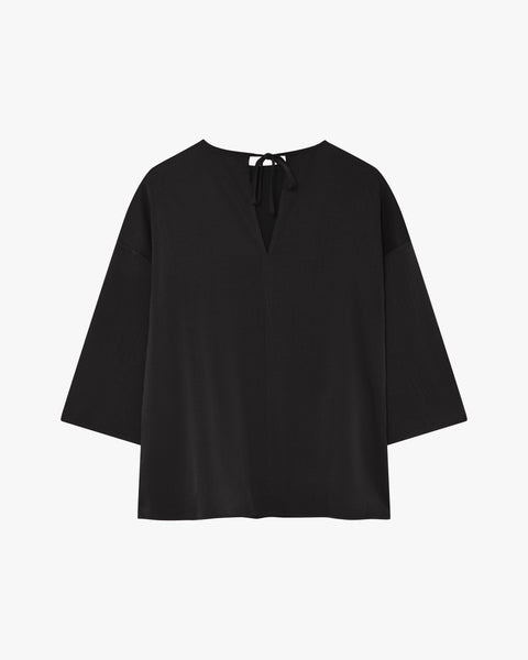 Elegant og tidløs bluse med enkel, løs passform. Modellen har rund hals, V-splitt med knyting bak og ¾-ermer for et sofistikert uttrykk. Den lette, vevde kvaliteten gir et pent fall og gjør blusen enkel å style både til bukser og skjørt – perfekt til både jobb og fest.