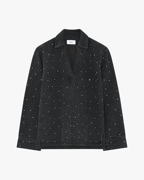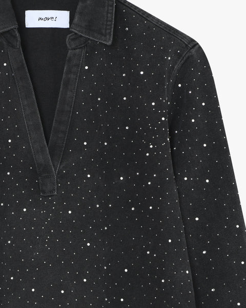 Gi hverdagslooken din et løft med Josefine Blouse fra Moves. Denne sorte denimskjorten med rhinestone-detaljer fanger lyset og gir et elegant, men avslappet uttrykk – perfekt til både jeans og dressbukser.